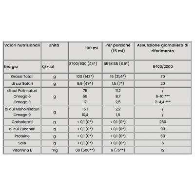 Modo d'uso: Basta solamente 15 ml (un cucchiaio) al giorno per soddisfare l'assunzione giornaliera consigliata di Omega 3 e il fabbisogno quotidiano raccomandato di Vitamina E.
