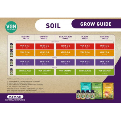 Dosaggio Aggiungi 1-3 ml di VGN 1-4-4 per 1 litro di acqua quando nutri le tue piante. Inizia l'applicazione dalla fine della fase vegetativa e aumenta il dosaggio durante la fioritura e la maturazione.